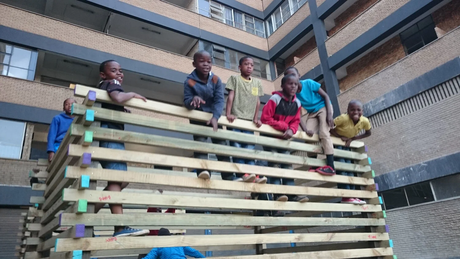 The Streetlight School playground is situated in the Bjala Square courtyard. The design team used low-cost and up-cycled materials as part of an innovative material pallet. Pallet planters were designed to act as seating elements along the courtyard edge and to introduce fragrance and colour as contrasting elements to the hard surroundings. These planters are also used for the growing of vegetables, which becomes an educational component of the school's curriculum.